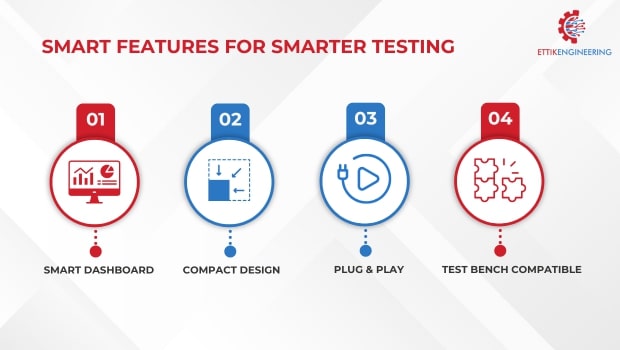 Smart features like dashboard, compact design, plug & play, and test bench support make testing easier.